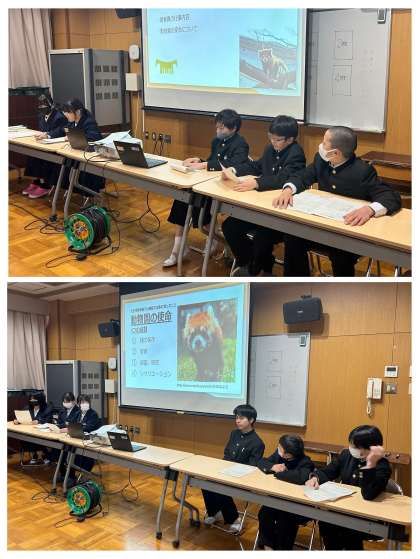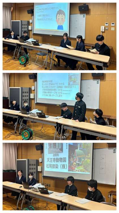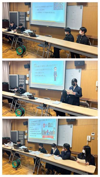 1つの班の発表時間は約5分程度の発表で、どの班も、作成した自分たちで作成したスライドに合わせて、全員が順に説明をしました。緊張の中、最後までていねいに発表をしてくれました。