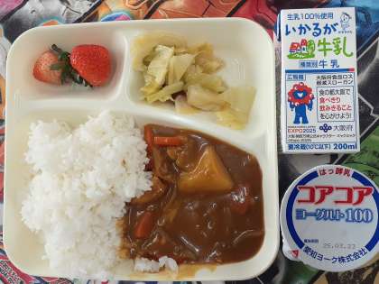 いちごは、今回も1人に2個ずつの配食です。甘くておいしいイチゴで、お替わりじゃんけん争奪戦でした。