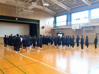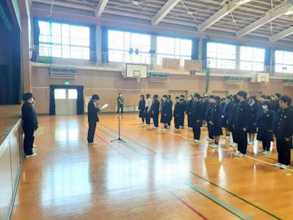 金曜日に3年生が卒業し、1・2年生だけのコンパクトな全校朝礼となりました。