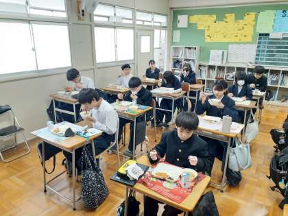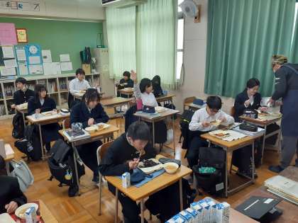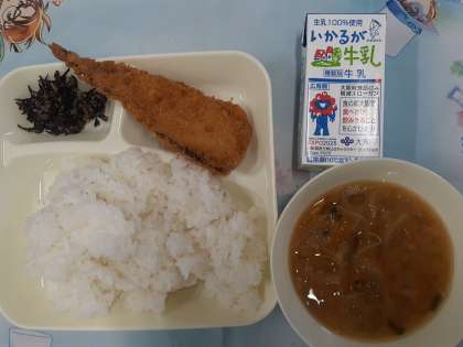 いわしフライは、頭を落とし開きにした大ぶりの冷凍の加工品を、菜種油でカラッと揚げています。1人1尾の配膳です。