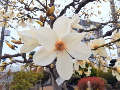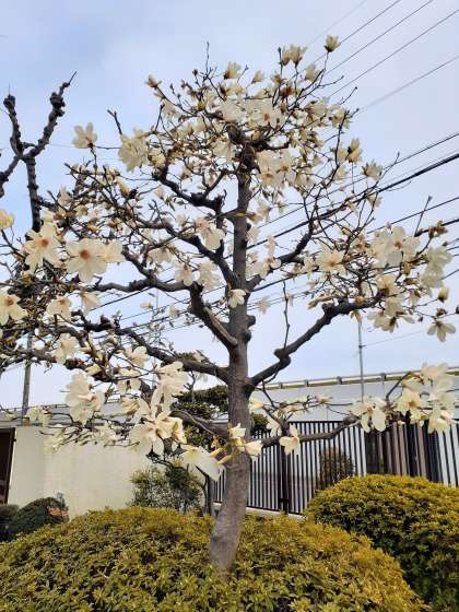 ハクモクレンの開花時期はとっても短く、たった2〜3日で花弁が茶色く染色し、落ちてしまいます。機会があれば見に来てください。
