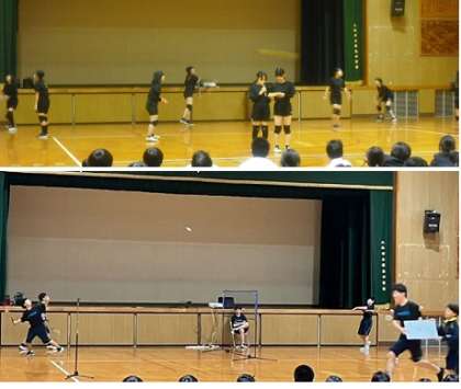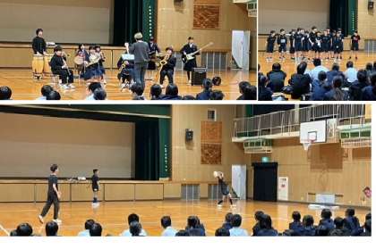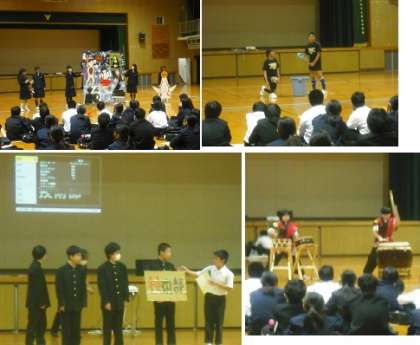 生徒会の司会進行で、太鼓部・バドミントン部・技術部・バレーボール部・美術部・ラグビー部・・吹奏楽部の順で、部の活動内容の紹介や模範演技を行いました。