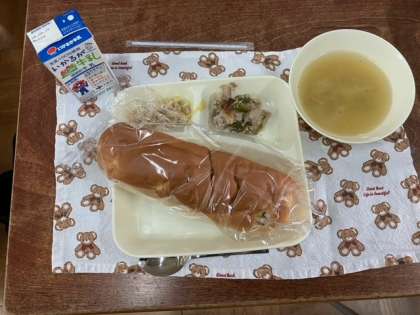 豚肉のガーリック焼きは、薄切りの豚肉をガーリック・塩・こしょう・しょう油などで下味を付けた後、焼き上げていました。スープは、鶏肉・ジャガイモ・玉ねぎ・人参・枝豆が入っており、具だくさんのチキンブイヨンスープでした。
