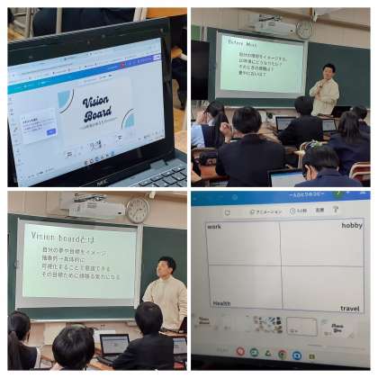 学習では「Vision Borad」というシートを用い、自分の夢や目標を可視化していきます。4つの項目があり、「work(将来に就きたい仕事)」・「health(健康を持続するために)」・「hobby(趣味や楽しいこと)」・「travel(旅行に行きたい場所)」をまずは考えます。そして、それぞれの項目において1番を決め、理想的な自分について言語化し、班内で発表・共有していき、自分という人物を知ってもらうと同時に、この1年間で何をどう頑張っていくのかを考えていきました。