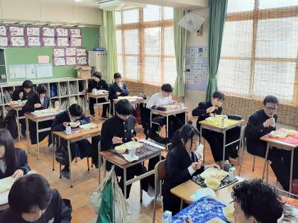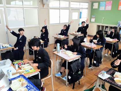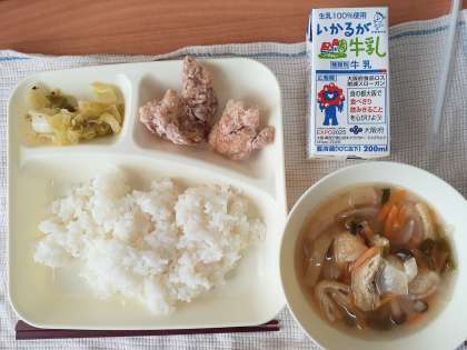 鶏肉の竜田揚げは、一口大の鶏肉にしょうが汁、しょうゆ、料理酒で下味を付けた後、でん粉をまぶし、菜種油でカラッと揚げられていました。唐揚げ同様に、生徒たちには大人気のメニューの1つです。お替わりじゃんけんに多くの手が挙がっていました。