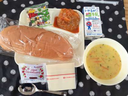 コーンスープは、キャベツと人参をお湯で煮て、煮上がった後に、粒状のコーンと、ペースト状のコーンを加え、チキンブイヨン、塩コショウ、しょう油で味付けし、最後に、彩りでパセリが加えられています。コーンの甘みが十分に出ていておいしく、たくさんお替りしてくれました。