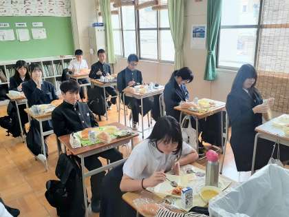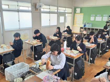コッペパンに煮込みハンバーグ、スライスチーズを挟み、特製チーズバーガーにして食べている生徒もいました。