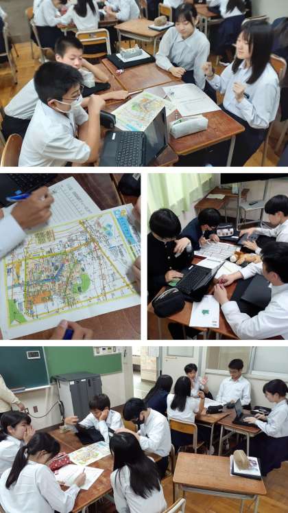 3年生は5・6時間目、修学旅行の取り組みです。前半は、これまでの続きで、倉敷美観地区でのグループ散策です。到着から出発まで、メンバーで話し合いながら、行きたい施設やお土産屋さん、食べ歩きしたいお店などの行動予定を決めていき、プリントにまとめていきました。学習者用端末を使ってのインターネット検索が大活躍です。
