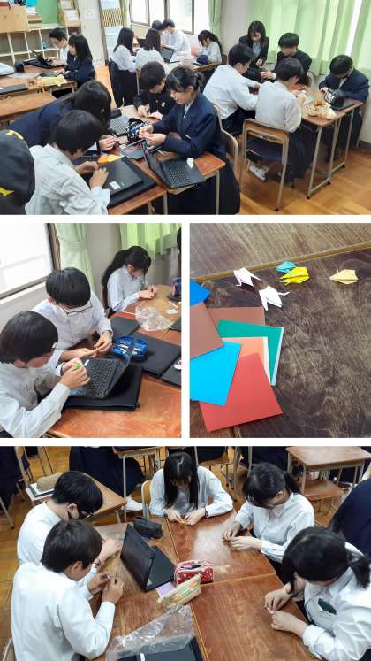 後半は、soraかさい(鶉のミュージアム)での平和学習で奉納する「千羽鶴」を作成しました。折り方が記憶に残っていて、スムーズに折り進められる生徒、ここでも、学習者用端末を屈指して、折り方画像や動画を見ながら折っている生徒、様々です。頑張って千羽を折りましょう。1000羽÷38人は・・・。