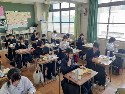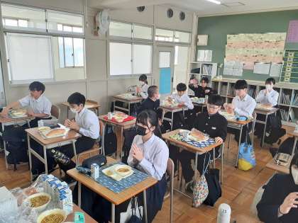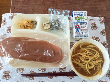 カレースープスパゲッティは、ベーコンを空煎りしてから、綿実油で鶏肉、玉ねぎ、ピーマンを炒め、湯を加えて後、しめじも加えて、カレールーの素(米粉)、チキンブイヨン、塩で味付けをし、最後に固めに下茹でしたスパゲッティを加えて煮込まれています。子どもたちに人気のカレーとスパゲッティ(パスタ)の最強の組み合わせで、食缶は一瞬で空っぽでした。