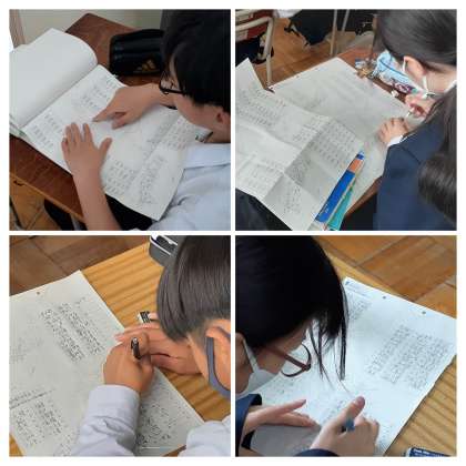 テスト後は相互採点です。先生からは特に間違えやすい、ケアレスミスの生じやすい漢字についての説明もありました。皆さんもどこまで正しく言えますでしょうか? 書けますでしょうか?