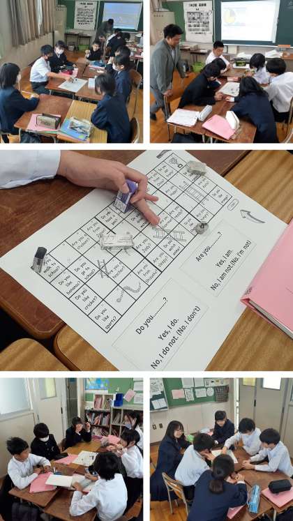 前半は班別での「Sugoroku(すごろく)」です。dice(サイコロ)を振って持ちコマの消しゴムを進めていきます。止まったマスには「Do you 〜 ?」や「Are you 〜 ?」が書かれていて、生徒はそれを読み上げ、「Yes , I am.」や「No , I don’t .」と自身に照らし合わせてで答えていきま。ゴールした生徒や、班の中で最も進んだ生徒にはシールのプレゼントもありました。
