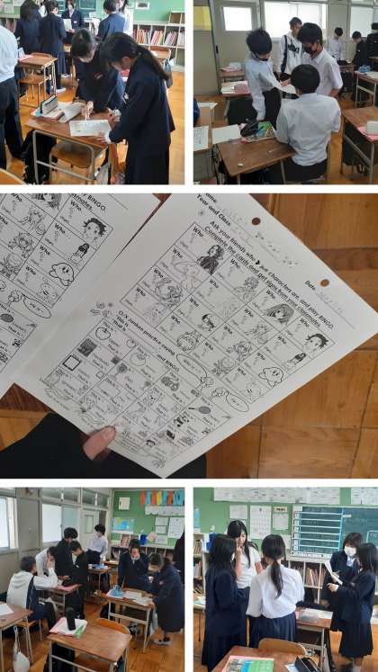 「he・she・it」や「who・where・what・when・why」の使い分けを一通り学んだ後、後半は、「Bingo」ゲームでした。シートには縦横4つずつ、様々なキャラクターが描かれています。生徒はお友だちに「Who is it ?」や「Who is he ?」と尋ね、「She is 〜 .」「It is 〜 .」と答えられればサインをもらいます。見事、ラインが揃ってビンゴした生徒にはシールのプレゼントでした。