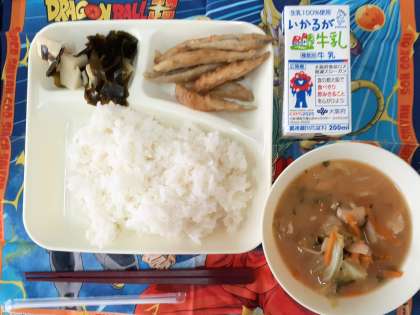 きびなごの天ぷらは、冷凍加工されたきびなごを綿実油でカラッと天ぷらにした後、しょうゆ、米酢、砂糖、みりんを合わせて煮たせて作った調味液が配缶時にかけられていました。頭から、骨ごとおいしくいただきました。8cm前後の大きさのためか、1人あたりの配食は7〜8尾となっていました。