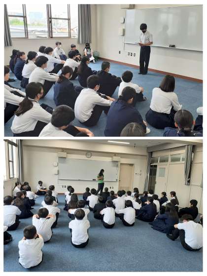 担当の先生からは、6月3日からの職場体験学習に関するお話でした。先生の大学生時代の様々な職種のアルバイト経験での出来事から「Experience is the best teacher .」という言葉が伝えられました。「経験を学びに繋げてほしい。」そのためには、人の話を素直に聞く、あいさつは大切、ミスをしたら素直にあやまれる、同じ間違いはしない、などでした。3日間の経験・体験を、将来の職業展望につなげていきましょう。
