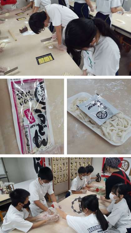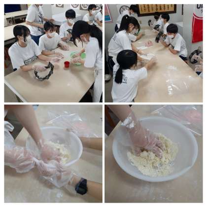 2時間目は、小麦粉と塩水を混ぜて、手ごね、足踏みで、グループでの協力作業となります。