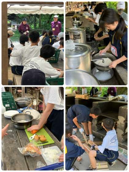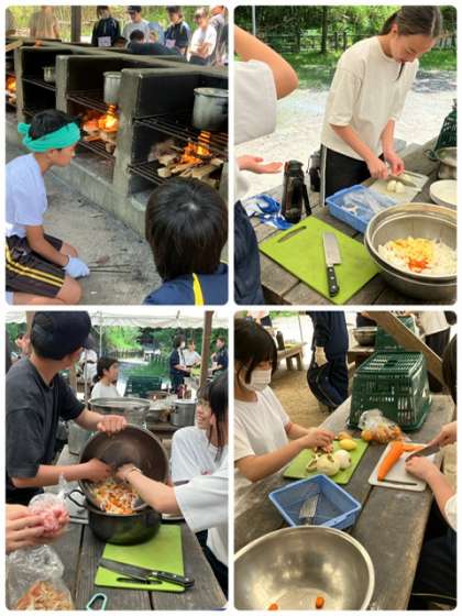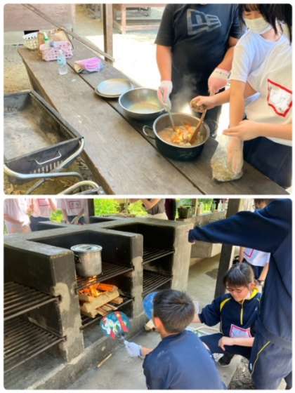 食材、食器、まきの係が中心に班で協力して、カレーライスをつくりました。