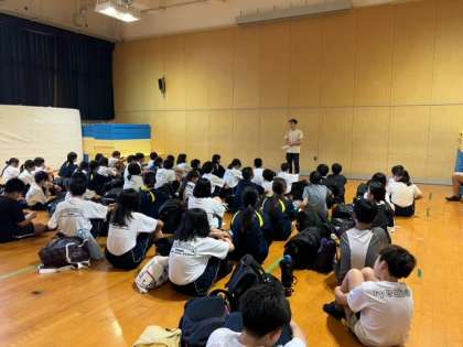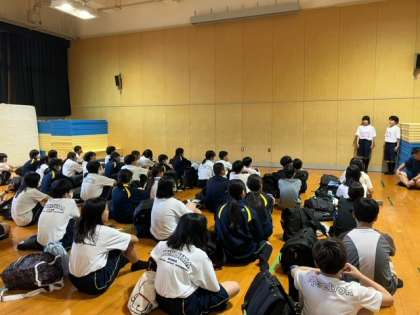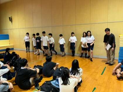 学校に到着し、格技室で解散式が行なわれました。先生からのお話で振り返りました。明日からの学校生活にいかしていきましょう。最後に、一泊移住実行委員が一泊移住の準備やレク大会、式の進行にがんばってくれたことに、みんなで拍手しました。