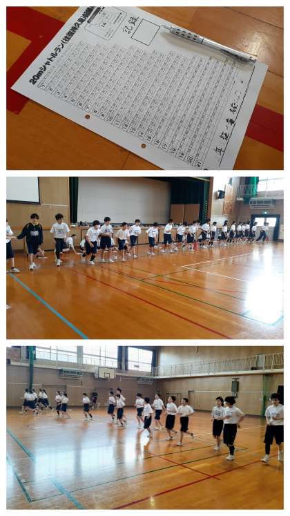 昨日の2年生の体育の学習の様子です。新体力テストの中で、最もきつい種目の「20mシャトルラン」の測定です。