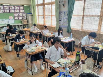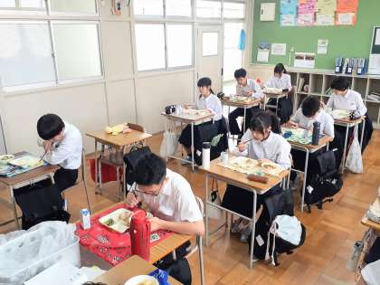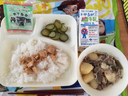 ごまかか炒めは、水煮の竹の子を小さくカットし、みりん、しょうゆとともに綿実油で炒めて、最後に料理名になっている「かつお節」と「煎りごま」が加えられていました。配膳後は、ごはんにかけて、混ぜごはん「竹の子ごはん」としておいしくいただきました。