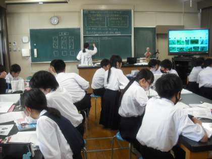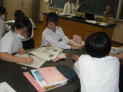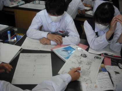 班で、肉食動物と草食動物を比べ、目の付き方、歯の形、足の形、腸の長さなどの違いが出てきました。そして、その特徴の理由を考え、発表しました。