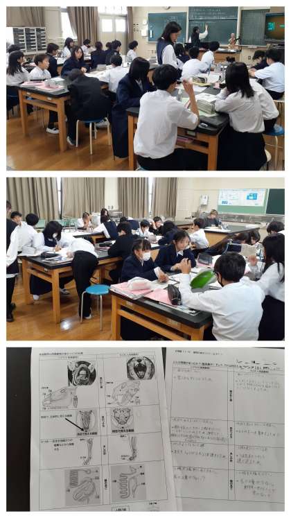 今日の学習は「草食動物と肉食動物の体のつくりの比較」です。プリントには、「草食動物」の代表として「シマウマ」、「肉食動物」の代表として「ライオン」の、「顔の形と歯」、「目のつき方」、「あしの形」、「腸の長さ」が比較して図で示されており、教科書や資料集なども加えて、「草食動物」と「肉食動物」の違いについて班で話し合いながら、ワークシートにまとめていきました。