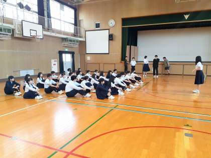 予鈴前には教室から体育館に移動してきて、整列、出席確認。予鈴とともに、学年委員さんから、今週のクラスの良かった点と悪かった点の報告、来週の予定が伝えられました。