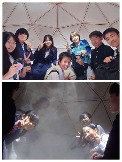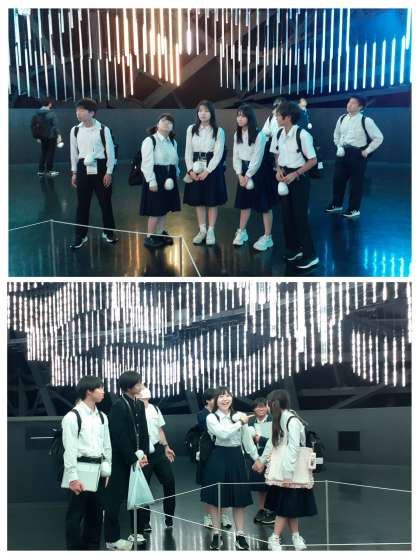 午前中は、時折の激しい雨、また、海沿いともあって風も強かったです。到着後のミャクミャク前での記念撮影もカットです。そのような中でも、生徒たちは、班で協力し合って、目を輝かせながら、元気よくパビリオンを見学し、2つの大きなミッションもこなしていきました。