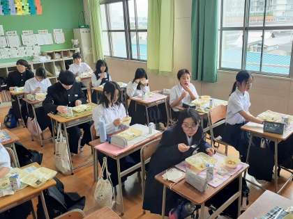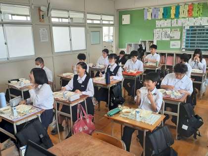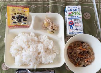 マーボー春雨は、綿実油でしょうがと豆板醤を香りよく炒め、牛と豚の合い挽き肉、玉ねぎ、人参、しいたけを加えてさらに炒めた後、お湯と春雨、ニラを加えて煮込みます。赤みそ、しょうゆ、砂糖、塩を合わせたタレで味付けをし、最後にニラも加えています。豆板醤のピリ辛がご飯のおかずにぴったりでした。