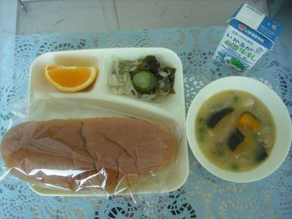 鶏肉とかぼちゃのシチューは、ワインで下味を付けた鶏肉に、カボチャ、ベーコン、玉ねぎ、マッシュルーム、グリーンピースが具材で、シチュールーの素で味付けをし、かぼちゃが軟らかくなるまで、しっかりと煮込まれていました。