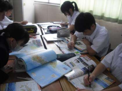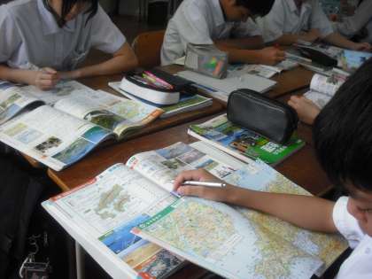 今日は、中国・四国地方の地形の学習です。問題集は、中国・四国の図の中に、山脈や河川などの名前を書きこむようになっています。生徒たちは地図帳を開き、見比べながら、あてはまる名称を記入して、覚えていきます。