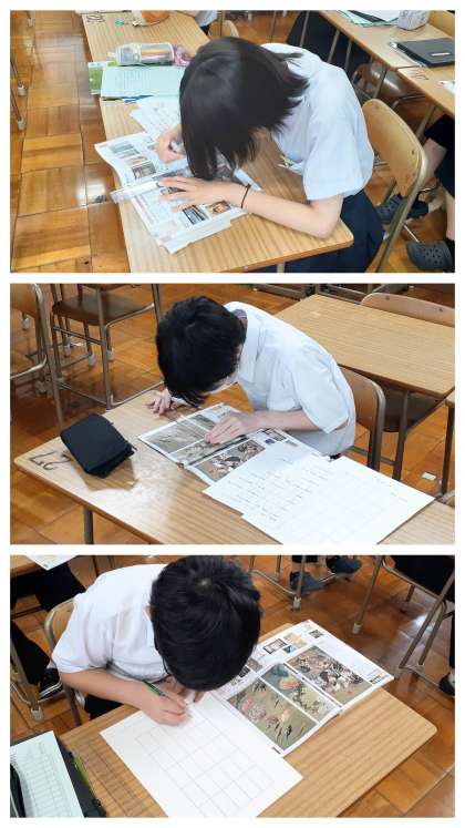 「模写」です。資料集のある6つの名画から、各自で1つを選び、拡大しながら、画用紙に模写していきます。今日は、資料集にある名画に縦横の補助線を引き25のマスに分割をします。終わった生徒から、1マスずつ慎重に画用紙に写し取っていきました。