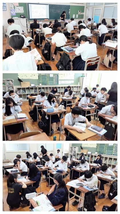 Unit3の「不定詞」の学習を進めていました。「to + 動詞原形」で「〜するために」です。教科書、プリント、ジョイフルワークを活用して、「We came here to do the job .」などのたくさんの文(例文)を扱い、集中して覚えていました。