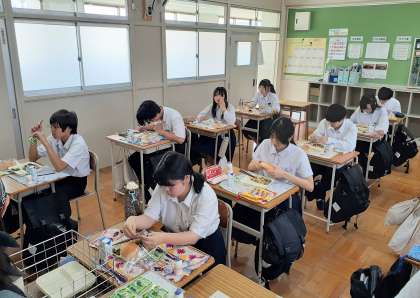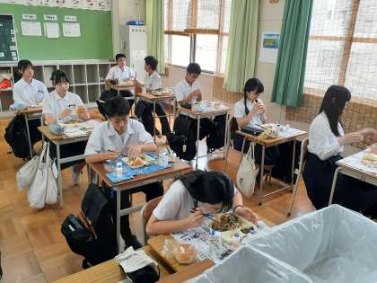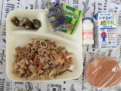 和風焼きそばは、豚肉、キャベツ、人参、玉ねぎ、ピーマンが具材で、炒め上げの後、「和風」のため、濃口しょうゆ、薄口しょうゆ、塩コショウで味付けられています。仕上げに1人1袋の刻みのりが付いています。今日はこの焼きそばがメインなので、お皿にたっぷりと配膳です。