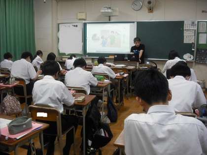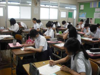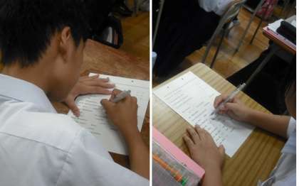 本文を読む音声を聞いて、プリントの空欄に入る単語を入れました。答え合わせは各自で行いました。次に1文ずつ先生が読み、それに続いて生徒が読みました。単語の発音やアクセントにも注意し、丁寧に練習しました。