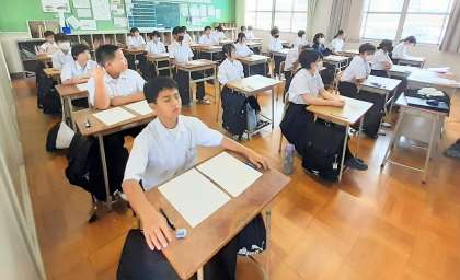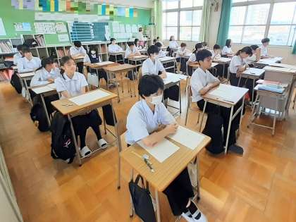 写真はテスト直前の1年生の様子です。配付されたテスト問題、解答用紙を前に集中力を高めています。まずは、今日の3教科、最後まで頑張りましょう。