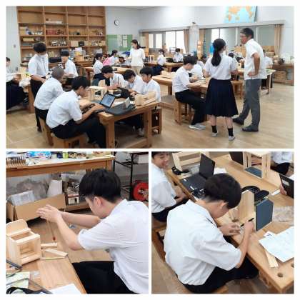 2年生の技術の学習の様子です。2年生では1年生の3学期より、木材を加工し、「本立て」や「収納ボックス」など、自分にとって必要な製品を制作してきました。