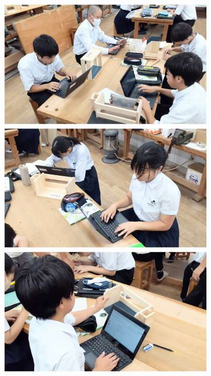 作業は最終段階に入り、今日は、製品が完成した生徒から、学習者用端末を使って、先生から事前に配付された基本となる「スライド」に、制作を振り返ってのレポートを作成しました。レポートには制作した作品の写真も学習者用端末で撮影し貼り付けます。
