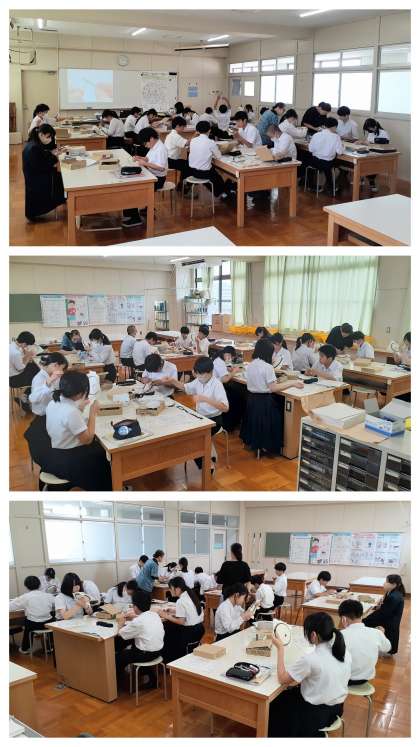 新たな実習題材の学習に入っていました。被服実習で、「クロスステッチ・クロック」です。主の作業は「クロスステッチ」なのですが、最後に電池式の時計本体と針を取り付け、お家の壁や机の上に配置し、使ってもらいます。