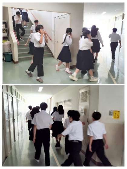 「4階調理室から火災が発生しました」の校内放送の合図で、中央階段は使わずに、西階段と東の非常階段を使って、担任の指示に従い、ハンカチで口を塞ぎながら、グランドへ避難しました。