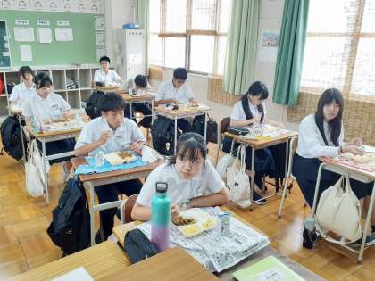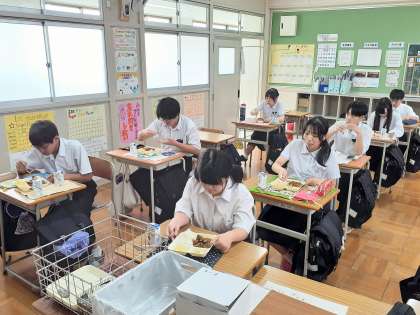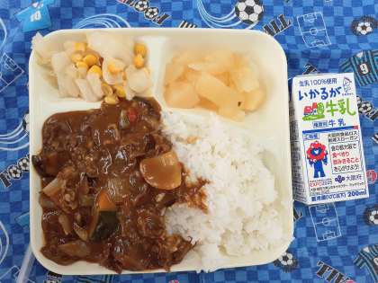 夏野菜のカレーライスは、薄切りの牛肉に、かぼちゃ、ナス、トマト、ピーマン、セロリの夏野菜と玉ねぎが具材です。じゃがいもの代わりに大きくカットされたかぼちゃがたっぷりと入っていました。にんにくとセロリの香りも引き立っています。アレルギー対応で米粉を使ったカレールウの素も使われています。ナスやピーマンを苦手とする生徒もいましたが、カレーライスは人気給食メニューです。ご飯、カレーともにお替りして大盛で食べていました。