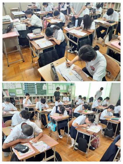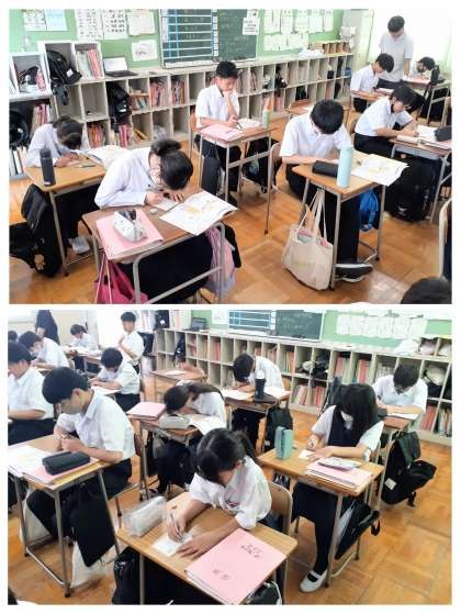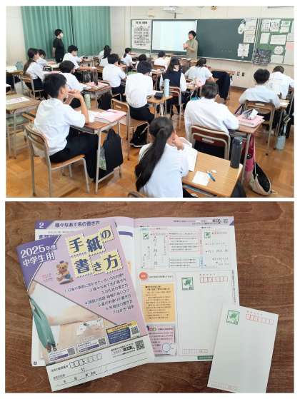 今日は、「手紙の書き方」というリーフレットを参考に、1人1枚ずつの郵便はがきが配られ、各自がそれぞれお世話になった柴中の先生へ「暑中見舞い」「残暑見舞い」のはがきを書くという学習でした。