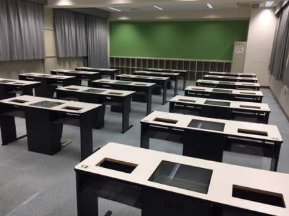このたび、LL教室の「カセットデッキ」のブースを取り除き、新しく机やいすを入れる改修工事を行いました。リニューアルされたLL教室をご覧ください。