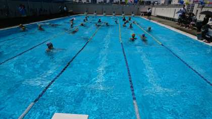 1・2限目に3年生、3・4限目に1年生、5・6限目に2年生が水泳大会を行いました。さわやかな晴天のもと、仲間を応援する声援が響いていました。どの学年もみんなで頑張った大会でした。フェスタにつながるいい大会になったと思います。