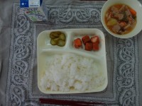 今日の給食は、パン・牛乳・焼きハンバーグ・豆乳コーンスープ・キャベツのカレーソテーです。
