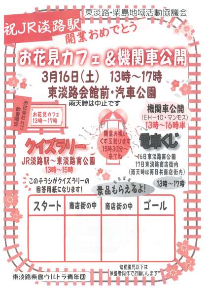 3月16日(土)、JR淡路駅の開業に合わせて、東淡路会館前の汽車公園で、お花見カフェ&機関車公開します。