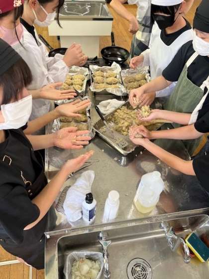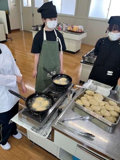 家庭科の先生のご指導のもと、バレー部の1・2年生で調理室を借りて「コロッケ」作りをしました。そして、明日に試合を控えている3年生に振る舞いました。
