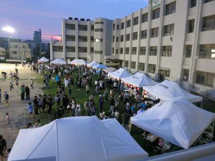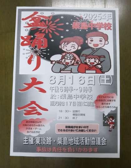 「盆踊り大会」は、東淡路小学校のグランドで行われていたのですが、昨年からは校舎建設工事のためグランドが使用できず、柴島中学校が会場となっています。