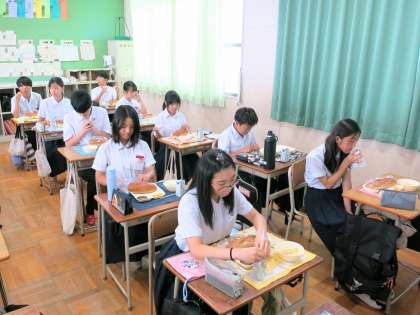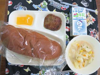 焼きハンバーグは、加工済みの小ぶりのハンバーグですが、焼き物機で外は焦げ目がついてサックリ、中身は柔らかくジューシーに焼き上げられていました。パンにはさんで、ハンバーガーにしている生徒もいました。贅沢ですが、ケチャップが欲しいところですね。