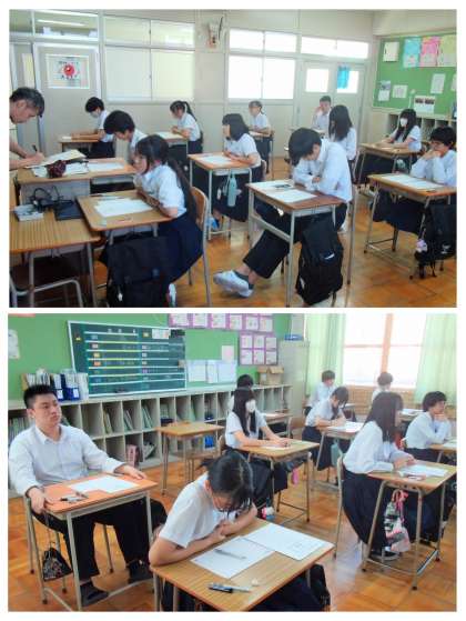 1時限目に「国語」、2時限目に「社会」、3時間目に「数学」、4時間目に「理科」、給食を挟んで、5時間目に「英語」の教科に関するテストを行いました。